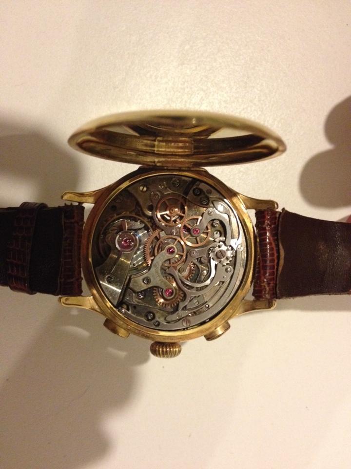 Riporto solo il brano più interessante, con due foto a maggior risoluzione. Il Cronografo Zenith Compur di Gisbert L. Brunner, Chronos 3/2001 "...I primi calibri cronografici funzionavano con solo un pulsante. Questo permetteva di effettuare le tre funzioni cronografiche partenza-arresto-azzeramento in modo sequenziale. All’inizio degli anni ’30 furono prodotti i cronografi a due pulsanti. Con il loro aiuto un qualunque processo di misurazione poteva essere interrotto e ripreso di nuovo. Il cronografo qui presentato si basa sul calibro Valjoux 22 da 14 linee, che era prodotto a partire dal 1914: il pulsante superiore, ad ore 2 opera mediante una lunga leva di comando che agisce sulla ruota a colonna con le tre funzioni sopra ricordate. Successivamente un orologiaio in house trasformò questo meccanismo dell’orologio per permettere l’arresto e la ripresa della misurazione. Poiché non era possibile, per motivi tecnici, la modifica del calibro egli sfruttò lo spazio sotto il quadrante. Lì installò un ulteriore ruota a colonna, azionata dal il pulsante ad ore 4 che la fa ruotare in senso in senso anti-orario, di un dente alla volta. Una molletta di arresto mantiene il dente nella rispettiva posizione. Attraverso un foro nella lamina opera con un lungo perno che agisce sulla bascula di rinvio. In seguito a ciò, come si può notare, per mezzo di questa modifica, il meccanismo dell’orologio dispone delle seguenti funzioni: start, stop e azzeramento per il pulsante ad ore 2, interruzione e ripresa della funzione cronografica per pulsante ad ore 4. Una curiosa, ma molto interessante, costruzione per i collezionisti di cronografi." (IMG:https://s8.postimg.cc/661mh8jxx/Bild_2.jpg) (IMG:https://s28.postimg.cc/id6lsapp9/Bild2_2.jpg) Fantastico Ps: questa specificazione della modifica "in house" deve far supporre che sia stata prima Zenith a sviluppare questo sistema? |